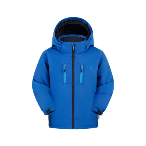 Keep them warm and dry on the mountain in the Kamik Kids Hux jacket. Featuring a bionic finish eco water repellant coating making the jacket perfect for rainy days. The full sleeves jacket features all polyfill insulation, 3m reflective details for safety, a snow skirt with gripping elastic, a detachable hood, and spandex knit cuffs.