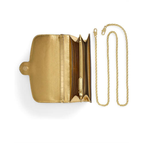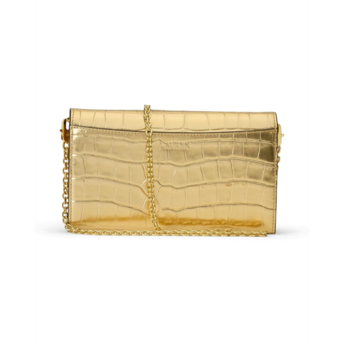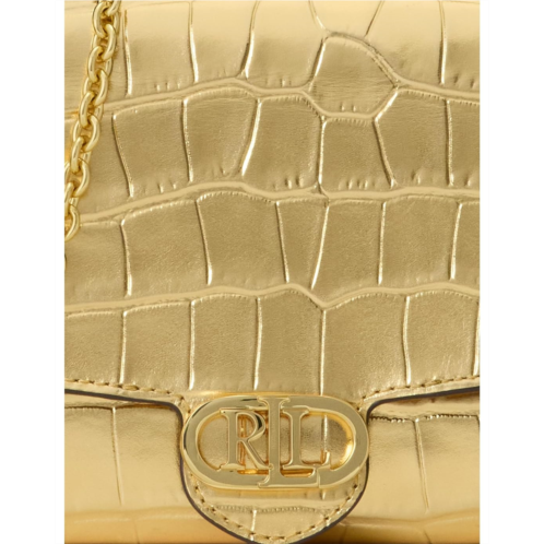 Crafted with metallic crocodile-embossed leather and finished with a modern chain strap, the Lauren Ralph Lauren Croc-embossed Medium Adair Crossbody combines the convenience of a crossbody bag with the essential storage of a wallet thanks to its compact silhouette and array of pockets. An oval-shaped LRL logo at the front provides a signature finish. This crossbody purse is designed with a magnetic snap closure and removable brass-finished chain crossbody strap.