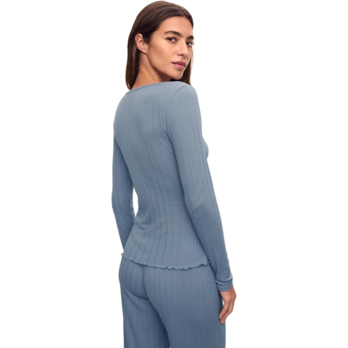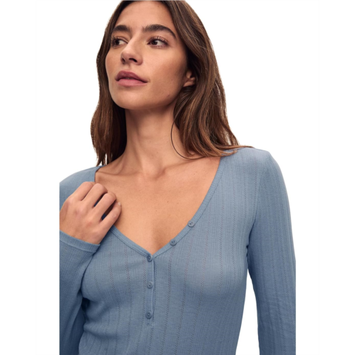 Feel comfortable and stylish as you lounge on a lazy day wearing the Eberjey Pointelle V-Neck Henley. The slim-fit top has a V-neckline, front button closure, a decorative placket, long sleeves, and a lettuce edge hem. The delicate stripe pattern adds a statement touch to the look effortlessly.