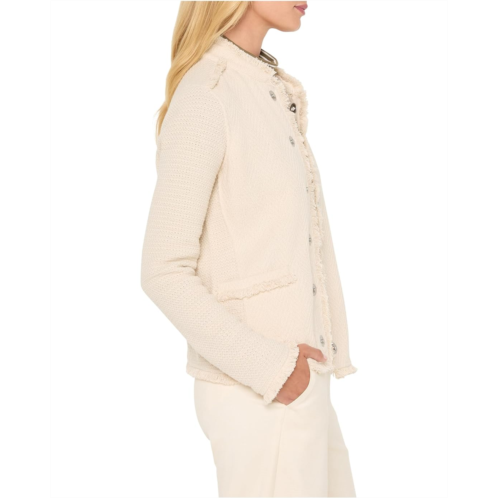 A member of the Fringe Mix fam with a mock collar, full button front, and placed epaulet fringe at the shoulder. Still with the sophisticated silhouette of a blazer or fashion jacket but with the feel of your favorite cardigan: an instant favorite for work, play, and whenever.