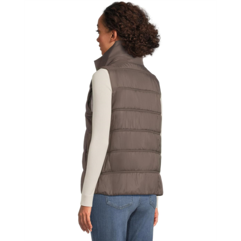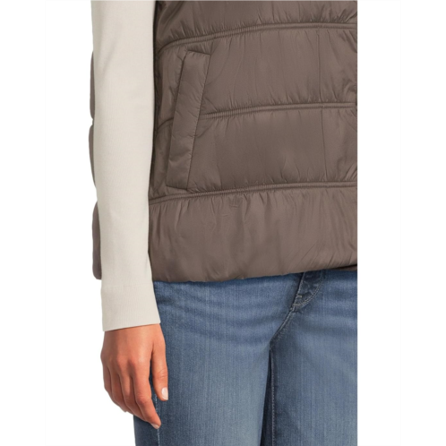 The EILEEN FISHER Eggshell High Collar Vest features a papery weave with softness and subtle luster, offering a refined texture that's both lightweight and visually appealing. It's insulated with PrimaLoft recycled polyester fill, made from plastic bottles, delivering warmth without bulk.