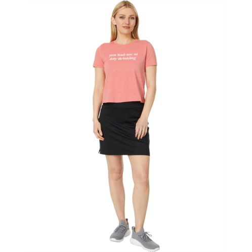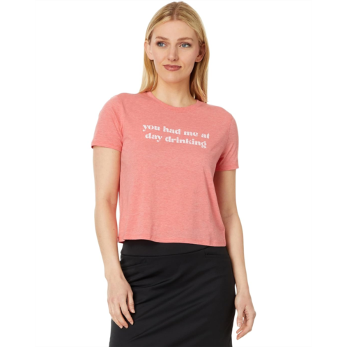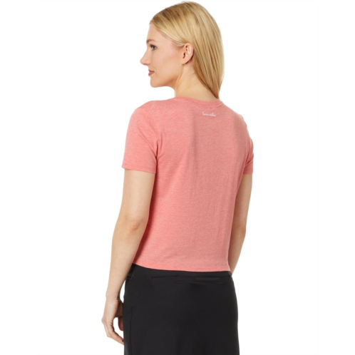 Fitted to flatter any body type, the TravisMathew Dancing Light Tee delivers a fresh take on a classic piece. The pull-on style tee features a crew neck, short sleeves, printed text on the chest, and a cropped silhouette with straight hem.