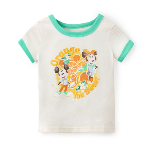 ''Orange you sweet?'' Mickey and Minnie sweeten your day with sunny orange thoughts that will bring back memories of Florida and California citrus and good times all around. This deluxe ringer tee features embroidered text and bright color inks plus pastel green trims to bring it all together.