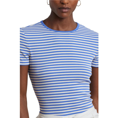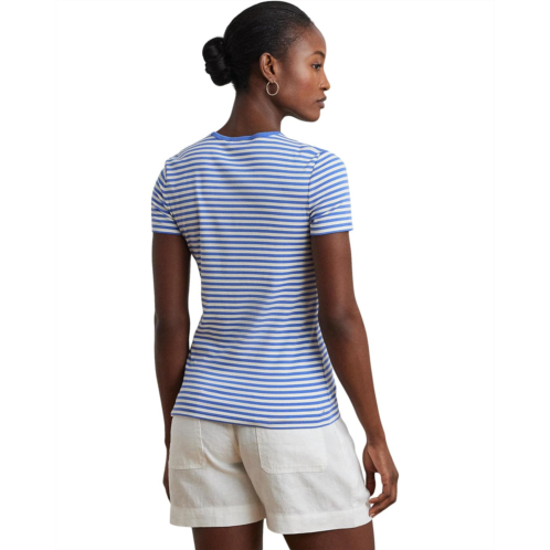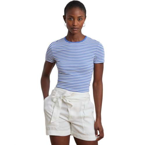 Exude style on an everyday basis wearing the comfy Lauren Ralph Lauren Striped Stretch Cotton Crewneck Tee. Yarn-dyed with timeless horizontal stripes, this essential regular-fit tee is made with lightweight stretch cotton for a soft hand. The pull-on style tee features a crewneck, short sleeves, and a straight hem with an 'LRL'-embroidered logo at the right hem. It is intended to hit at the hip.