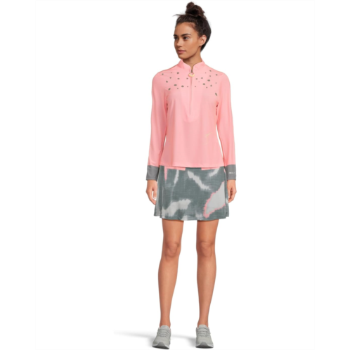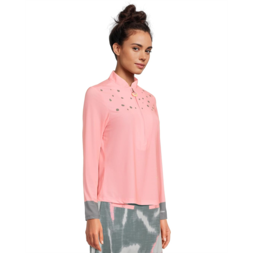 The Jamie Sadock Raindrops Print Long Sleeve Sunsense Top blends comfort and a hint of style. The pull-on style top features a Mandarin neck, a quarter-zipper closure, an eye-catching print on the upper body, long sleeves, and a straight hem.