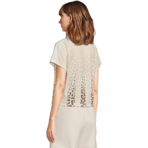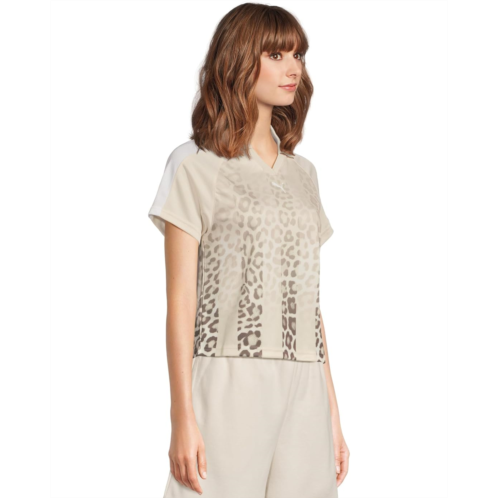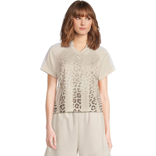 Elevate your style choosing the PUMA T7 Leo Luxe Relaxed Soccer Jersey, featuring sporty T7 panel inserts, a bold all-over animal print, and the iconic PUMA Cat Logo in rubber print on the chest. Perfect for adding a trendy and eye-catching flair to your outfit. It has a crew neckline, short sleeves, and a straight hem.