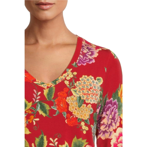 The spirit of chic, Johnny Was The Janie Favorite Long Sleeve V-Neck Fitted Tee. Crafted in a relaxed fit that flatters every silhouette, this pull-on essential features a classic V-neck and long sleeves for all-season comfort. The real showstopper? A stunning floral pattern bursting with rich jewel tones set against a striking red backdrop, creating a look that's equal parts bold, feminine, and beautifully bohemian. Soft, breathable, and irresistibly comfortable, it's the perfect top for adding instant artistry and color to your everyday wardrobe.
