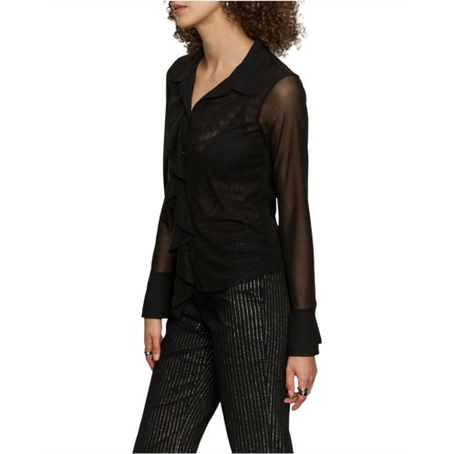 Effortless chic meets dreamy romance wearing the Sanctuary Dreamland Ruffle Top is your go-to for elevated everyday style. Designed with a classic fit that flatters every figure, this versatile piece brings a touch of sophistication to any wardrobe. The collared neck lends a polished finish, while the long sleeves add just the right amount of coverage, making it perfect for workdays, nights out, or layering with your favorite pieces. The pull-on design ensures ease and comfort, while the delicate mesh construction with ruffle detailing at the front adds movement, charm, and a whisper of femininity.