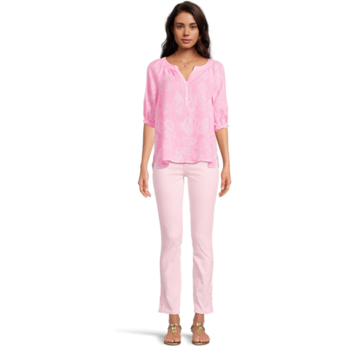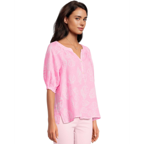 The Lilly Pulitzer Caprina Top is an easy fit blouse crafted from Seacoast Linen for lightweight comfort and effortless style. It features a notch neckline, elbow-length sleeves, a pullover silhouette, and a vented hem that adds playful movement.