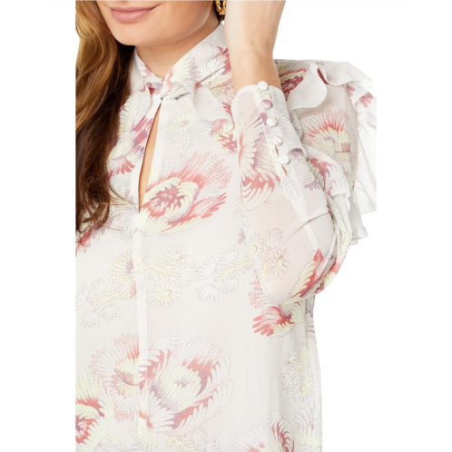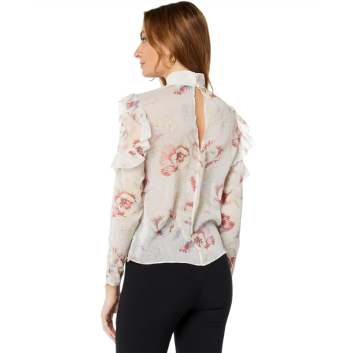 High neckline with frill design and long sleeves with buttoned cuffs.