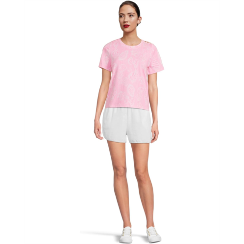 The Lilly Pulitzer Barreto Knit Top is a vibrant wardrobe staple with a playful twist. Featuring a straight fit, crew neckline, and short sleeves, this top stands out with its colorful printed details and stylish, branded buttons at the left shoulder. Perfect for pairing with your favorite shorts or skirts, it brings effortless charm to any casual look.