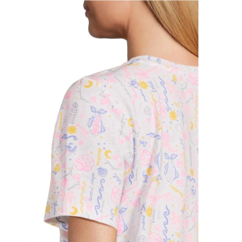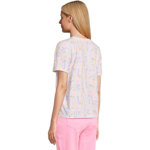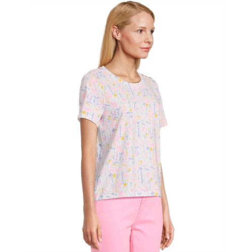 The Lilly Pulitzer Barreto Knit Top is a vibrant wardrobe staple with a playful twist. Featuring a straight fit, crew neckline, and short sleeves, this top stands out with its colorful printed details and stylish, branded buttons at the left shoulder. Perfect for pairing with your favorite shorts or skirts, it brings effortless charm to any casual look.