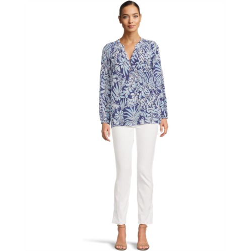 Loose-fitting printed blouse is fabricated from a fluid woven silk.