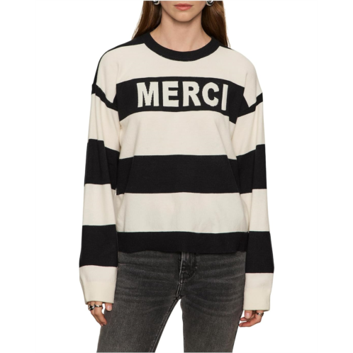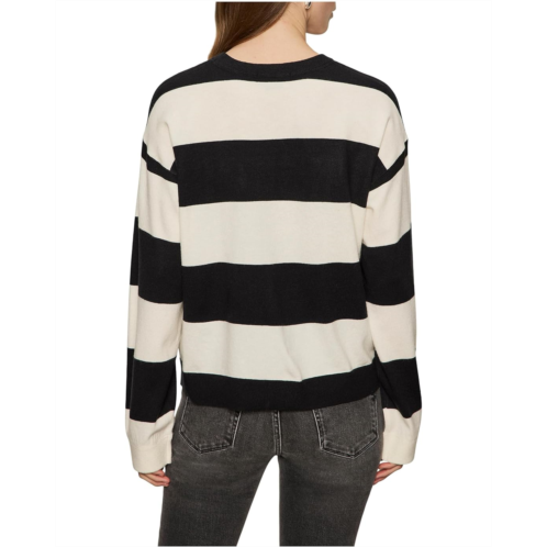 Textured knit sweater flaunts contrast panels and trim for sleek style.