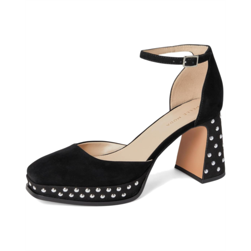 The Pelle Moda Dietta Heel is a two-piece platform pump with a square-toe design and soft suede upper. Wrapped in leather with metal grommets around the shoe, the heel is a block shape and the ankle strap has an adjustable buckle. These mid-top heels feature a faux leather lining and a padded faux leather insole.