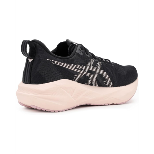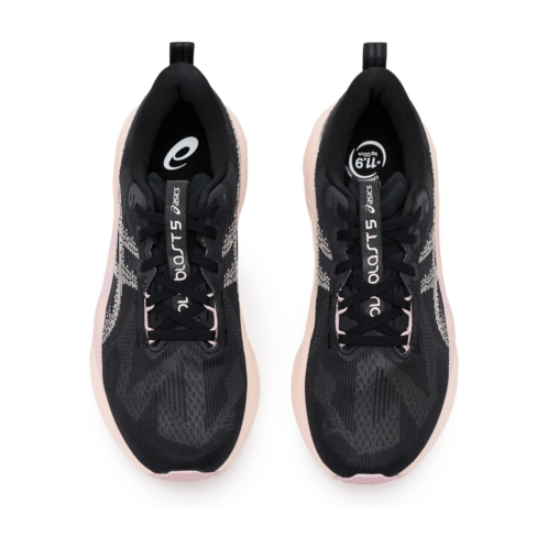- The ASICS Novablast 5 shoes' midsole and outsole geometry help produce an energized ride. Their tongue wing construction in the polyester upper helps improve the fit while reducing tongue movement. These running shoes are made of a rubber insole and polyester lining. At least 75% of the shoe's main upper material is made with recycled materials to reduce waste and carbon emissions while the sockliner is produced with the solution dyeing process that reduces water usage by approximately 33% and carbon emissions by approximately 45% compared to the conventional dyeing technology. The FF BLAST MAX cushioning helps create softer landings and more energized toe-off during your training. These lace-up shoes are complemented with an engineered jacquard upper that offers more stretch, ventilation, and durability.