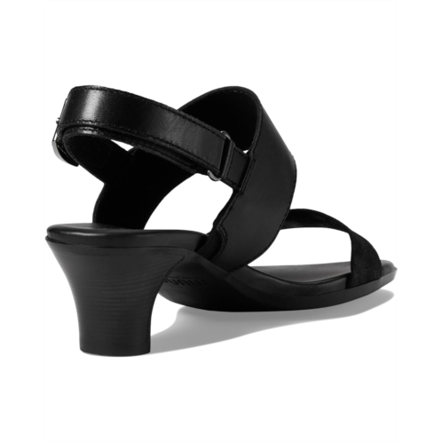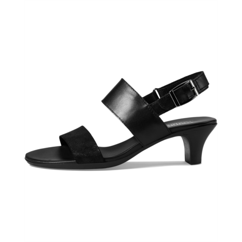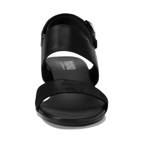 Let your feet feel comfortable by taking every step in the Munro Livia. The slip-on sandals have a double band with a hook-and-loop adjustable backstrap under the buckle, an open almond-toe design, and kitten heels. The sandals have a leawood insert at the heel for a relevant timeless texture. The mid-heel height sandals have leather upper, faux suede lining, padded silhouette, and leather insole for added comfort.