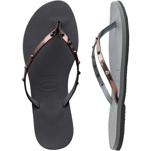 Comfortable and subtly stylish for your vacation at the beach, the Havaianas You Spike Sandals are designed with classy toe post design. These flip-flops are crafted with a rubber upper and lining that pops up the spike embellishment on the metallic silhouette straps.