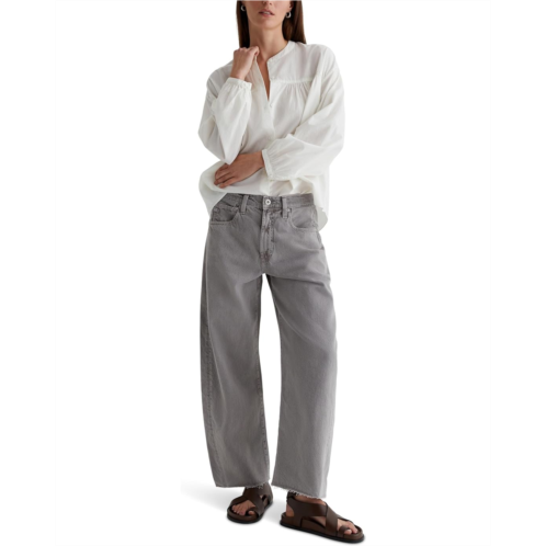 The AG Jeans Hattie High-Rise Crop Barrel in Sulfur Pebble Grey features an arched shape through the leg, accentuated forward side seam paneling that hits at the ankle for a modern proportion.