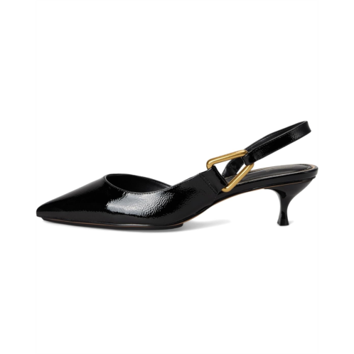 The Vince Camuto Inari Lasso Buckle Slingback Pumps feature a glossy naplack finish that radiates confidence and sophistication. Their sleek, pointed toe shape elongates the leg, while the delicate kitten heels offer a perfect balance of elegance and comfort. A gold-tone geometric accent on the slingback strap adds a modern touch, enhancing its chic appeal. These heeled pumps are made of a leather upper, rubber insole, and polyester lining. Ideal for both day and evening wear, the versatile design of these slingback pumps effortlessly transitions from office attire to special occasions, making them a must-have statement piece in any wardrobe.