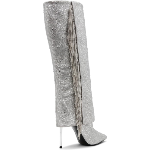 The Steve Madden Sanya Knee-High Boots boast an extremely captivating look with the rhinestone embellishments and side fringe panel. With a pointed toe silhouette, the pull-on footwear features synthetic upper and a sleek stiletto heel.