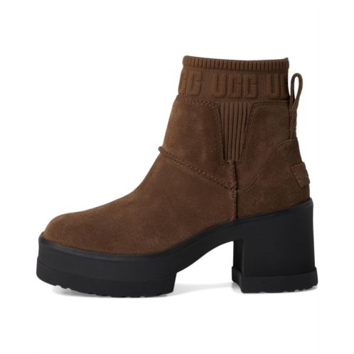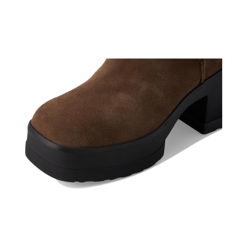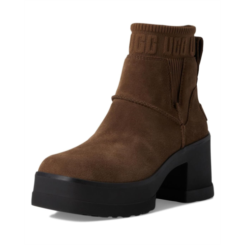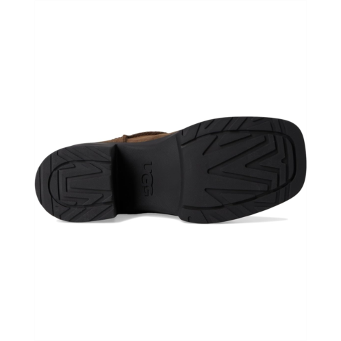 If you love our Brooklyn boot, you'll adore the UGG Moxy Chelsea. It delivers the features you love about the Brooklyn like the chunky lug sole, Twin Seam details, and The Graphic UGG Font knit gore, and adds a chic, square toe. The upper is crafted with water-resistant suede and lined with soft microfiber for wear-all-day comfort. Set upon a lightweight rubber outsole that adds 2' of height at the platform, and 3' at the heel.