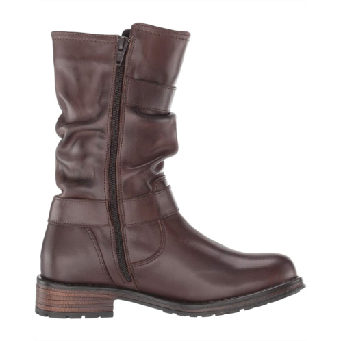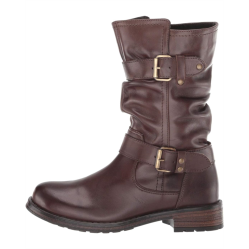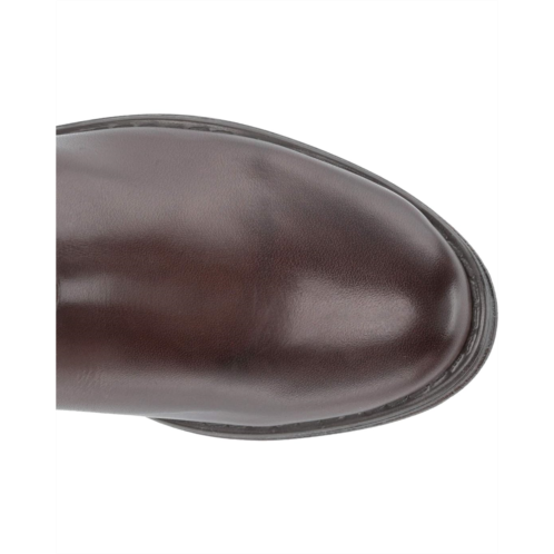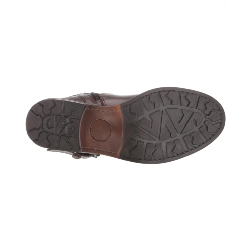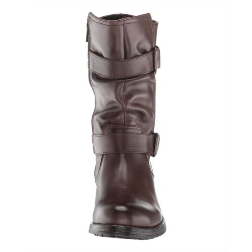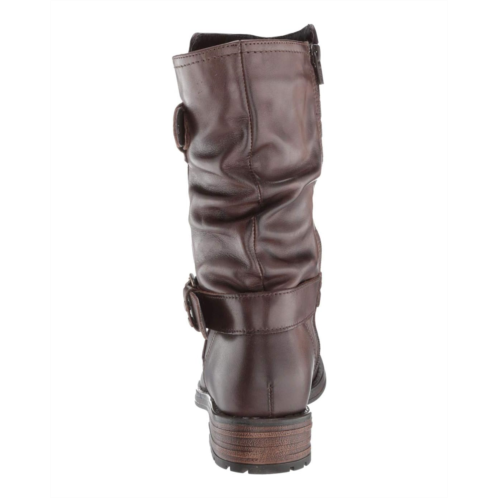 Motorcycle boot features a leather upper and adjustable buckle accents.
