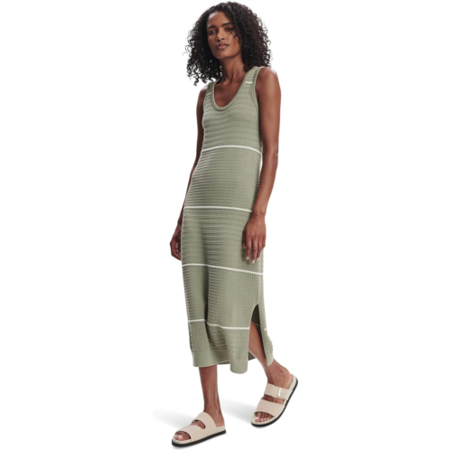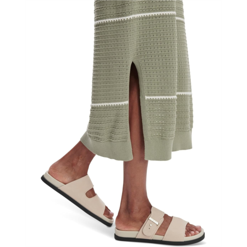 The Varley Scott Scoop Neck Midi Dress is an elegant model dress inspired by Dwight and features the same striped pointelle knit with contrast stitching running through the body. The scoop neckline and side slits give it a contemporary touch. This striped dress is made from cotton fabric that provides all-day comfort. It is styled with a sleeveless design and a straight hem.