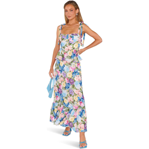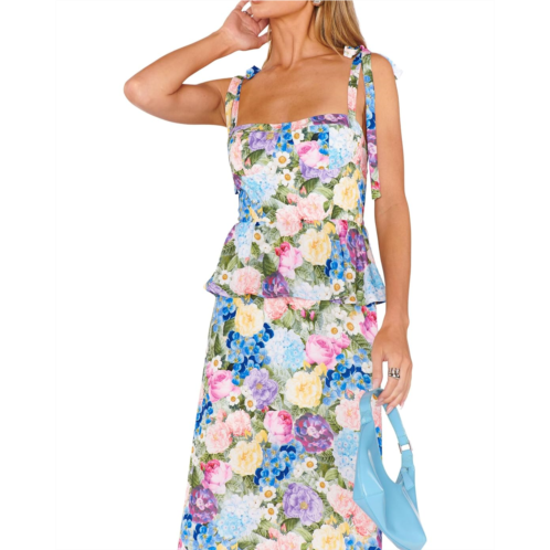 Elevate your warm weather style in the chic Show Me Your Mumu Paxton Midi Dress. Featuring a square neckline with adjustable tie shoulder straps, peplum waist, smocked back, and a ruffle hemline.