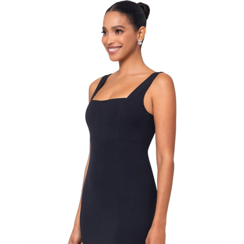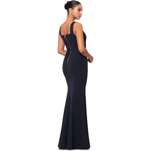 Make a gorgeous and graceful entry at the party wearing the Betsy & Adam Long knit square neck mermaid Dress. Framed in a sleek, figure-hugging mermaid silhouette, the dress features a sleeveless bodice with a squared neckline and a zippered back. The floor-length skirt opens at the knee-length and finishes with neat pleats.
