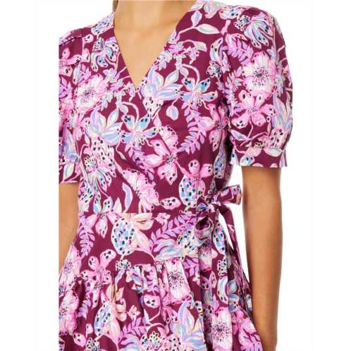Let your personality shine in a new color by wearing Lilly Pulitzer Alexandria Elbow Sleeve C dress. The flare wrap skirt makes this dress unique. It is designed with a surplice neckline, waist tie, and elbow-length sleeves with pleated details. A tiered ruffle at the skirt lets you move freely outdoors. It is printed stylistically with oversized leafy design.