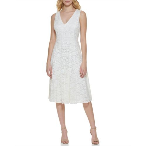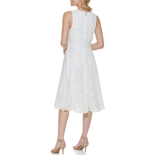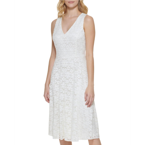 Add some flair to your look wearing the Tommy Hilfiger Daisy Lace Fit and Flare. This fully lined dress features V-neckline, sleeveless style, below the knee length, and allover lace detailing.