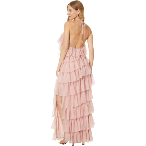 Revolutionize the way you dress by styling the Betsy & Adam's Long Mesh Multi Tier Tie Neck gown. Cascading tiers of delicate mesh evoke a whimsical allure, while the tie neck closure adds a touch of romance. With its floor-length silhouette, lace embellishments, and backless design, it exudes sophistication and grace.