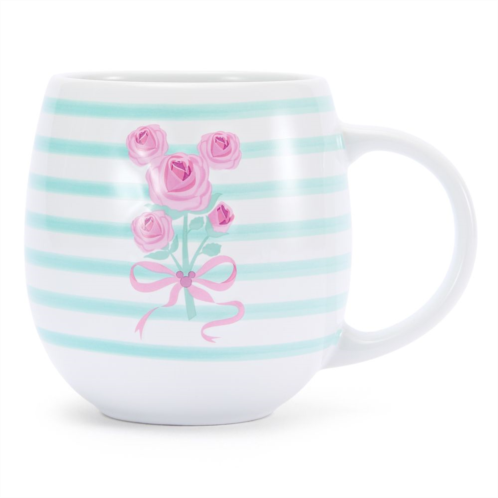 A Mickey Mouse icon made of pink roses decorates this tranquil coffee mug with bas relief art on both sides. Coquettish ribbon and bows complement the floral theme, back by a striped glaze pattern. Sip away in serenity.