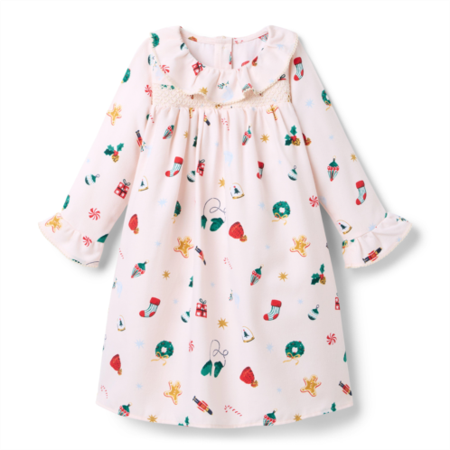 Holiday dreams are extra sweet with our cozy nightgown. Featuring a holiday treats print and smocked detail at the bodice, plus picot trim and ruffles at the collar and cuffs.