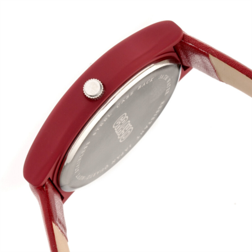 Red rubber-coated metal case with a red leatherette strap. Fixed red rubber-coated metal bezel. Red (blue center) dial with silver-tone hands and Arabic numeral hour markers. Dial Type: Analog. Quartz movement. Scratch resistant mineral crystal. Solid case back. Round case shape. Case size: 36 mm. Case thickness: 9 mm. Band width: 20 mm. Tang clasp. Water resistant at 30 meters / 100 feet. Functions: hour, minute, second. Jubilee Series. Casual watch style. Watch label: Japan Movt. Crayo Jubilee Blue Dial Red Leatherette Watch CRACR4603.