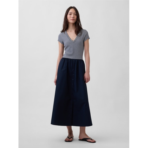 - Soft stretch modal-blend top with a crisp cotton poplin skirt mixed media dress.