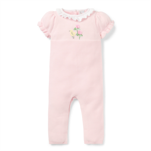 First spring moments are extra special in our soft knit romper. Detailed with a ruffle collar, intarsia-knit florals and fringe details, plus little ruffle cuffs.