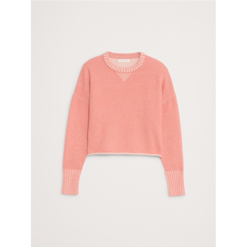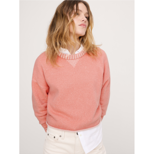 - We reimagined the athletic silhouette of a classic crew-neck sweatshirt in our best-selling Merino wool-cotton yarn. Here, the yarn is plaited to create a two-color effect and the fit is relaxed and a bit short to show off high-rise styles.