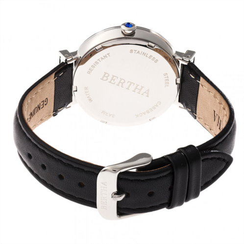 Silver-tone stainless steel case with a black leather strap. Fixed silver-tone stainless steel set with crystals bezel. Mother of pearl (humming bird) dial with silver-tone Breguet-style shape hands and index hour markers. Dial Type: Analog. Luminescent hands. Quartz movement. Scratch resistant mineral crystal. Pull / push crown. Solid case back. Round case shape, case size: 37 mm, case thickness: 9 mm. Band width: 18 mm. Tang clasp. Water resistant at 30 meters / 100 feet. Functions: hour, minute, second. Dress watch style. Watch label: Japan Movt. Item Variations: BTHBR7804. Bertha Emily Crystal Mother of Pearl Dial Ladies Watch BR7804.