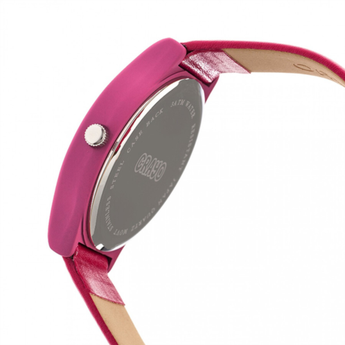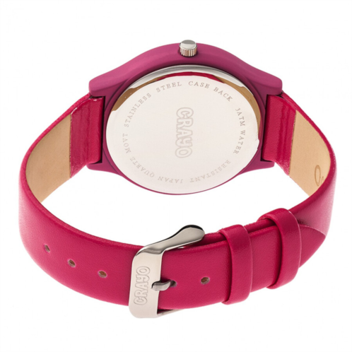 Hot pink stainless steel case with a hot pink leatherette strap. Fixed hot pink metal bezel. Blue dial with silver-tone hands and Arabic numeral hour markers. Dial Type: Analog. Quartz movement. Scratch resistant mineral crystal. Pull / push crown. Solid case back. Round case shape, case size: 36 mm, case thickness: 9 mm. Band width: 20 mm. Buckle clasp. Water resistant at 30 meters / 100 feet. Functions: hour, minute, second. Casual watch style. Watch label: Japan Movt. Crayo Jubilee Blue Dial Watch CRACR4607.