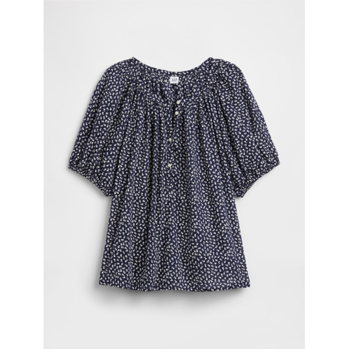 - Shirring at round neckline, half-button front.