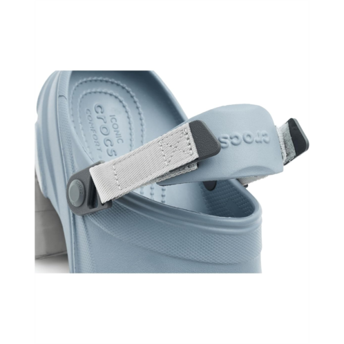 - Travel. exploration. adventures near and far. The Classic All-Terrain Clog is ready for it all, even in the harshest environments. With a more rugged outsole and an adjustable turbo strap, the ground beneath your feet has never felt more surmountable. Lightweight Croslite construction makes them a practical and packable choice for any outing. It's time to shift into all-wheel drive. Flip that strap back and go find your fun!