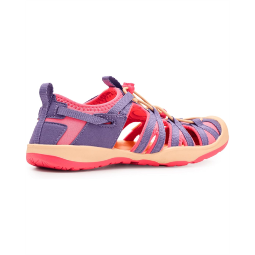 - Sporty sandal is designed with a protective toe bumper, bungee lacing with an adjustable toggle, and a padded collar with a pull-tab heel. Constructed with a cushioned EVA footbed and a lugged rubber outsole to provide grip and traction for different terrains.