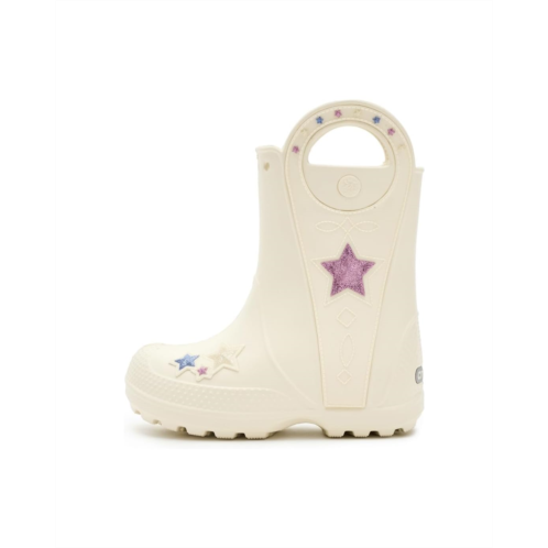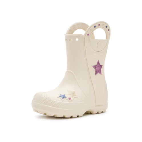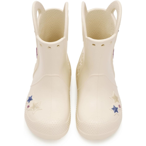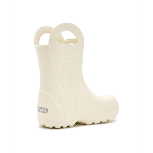 - Now kids can enjoy classic Crocs comfort - even on the rainiest days. These Crocs Kids Handle It Rain Boots with a waterproof build keeps puddle-jumping feet cozy and dry. The oversized handles make it easy for kids to take these boots on and off, and they also include a reflective heel logo for safety. This version features a fixed rainbow embellishment and squishy EVA clouds. The calf-high boots are crafted from EVA upper, insole, and outsole. These girl's and boy's rain boots are a parent's dream - a simple wipe or rinse, and they're good as new!