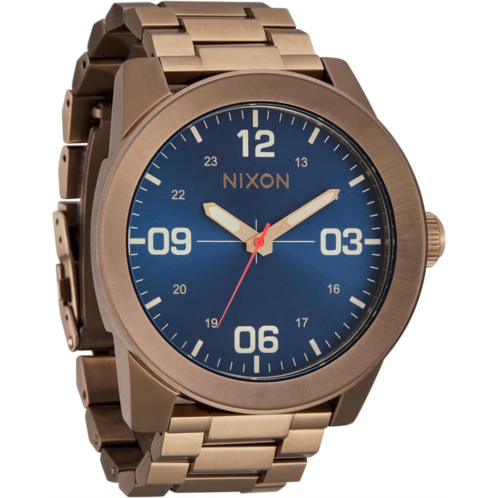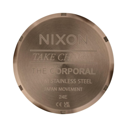 - The Nixon Corporal Stainless Steel watch with a clear, tactical advantage. The face is protected by a recessed crystal and the oversized bezel brings out the best in rugged durability. It's functional design combined with details like faceted links that look like a mountain range when viewed from the side means the Corporal always has the high ground. The stainless steel watch feature Miyota Japanese Quartz three-hand and double locking foldover clasp closure.