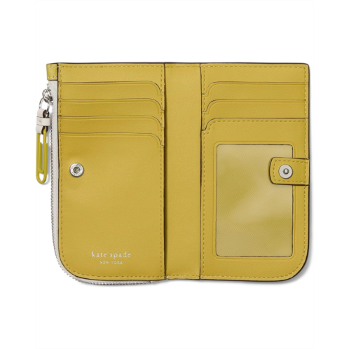 - Featuring an eye-catching allover print with internal storage for cards and cash, the Kate Spade New York Page Turner Bestsellers Print Smooth Leather Small Slim Bifold Wallet perfectly fits your handbag. The bifold leather wallet features a zippered pocket, credit card compartments, an ID pocket, and a snap-button closure for enhanced security.