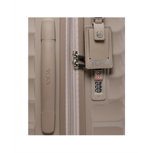 - Striking from any distance, this Tumi 19 Degree International Expandable 4 Wheel carry-on boasts the brand's most iconic design code: precise 19-degree angles cascading in fluid, sculpted contours. The compression straps, retractable top, side carry handles, and a 3-stage telescoping handle make it easy to carry around. This trolley bag is designed with two zippered interior pockets, a dual-compartment zippered pocket, a TUMI tracer, an integrated TSA lock, a built-in USB-C charging port (supports up to 65W USB-C 2.0 cables and fast charging up to 65W 3A), a zipper expansion, and four recessed dual spinner wheels. Made from polycarbonate, it has a PROTX2-coated lining. Offering zippered entry to the main compartment, this carry-on bag is lightweight, resilient, and perfect for international and domestic travel.
