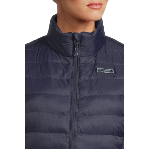 Meet the vineyard vines Shoreline Packable Channeled Cire Puffer Vest, your go-to essential for breezy mornings and crisp evenings. Designed with a sleek mock neck and zippered front closure, this sleeveless wonder keeps you warm without restricting movement. Thoughtfully crafted zippered hand pockets offer secure storage for your essentials, while its packable design ensures you can effortlessly stash it in your bag for on-the-go adventures. The channeled construction adds a contemporary edge, giving you a polished, streamlined look whether you're strolling the harbor, hiking trails, or running errands around town.