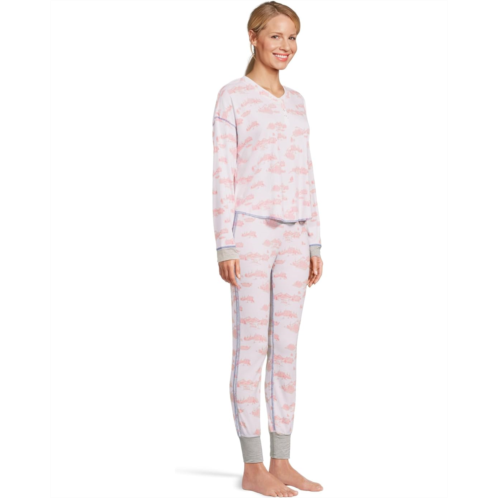 A long sleeve henley crewneck paired with high rise joggers in a stretchy, ribbed jersey fabric. With allover print, you'll be ready for a day of lounging or a restful evening.